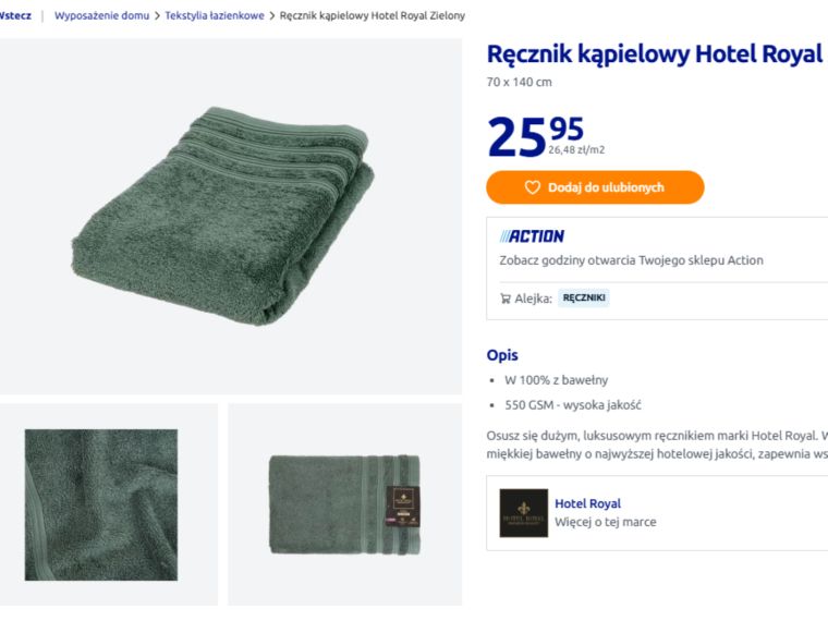 Ręczniki inspirowane hotelowym standardem od kilku lat cieszą się ogromną popularnością. Są grubsze, bardziej chłonne i znacznie przyjemniejsze w dotyku niż wiele tańszych modeli dostępnych w sklepach. Model dostępny w Action pochodzi z kolekcji Hotel Royal i już sama nazwa sugeruje, do jakiego standardu nawiązuje. Ręcznik wykonany jest w 100% z bawełny, co jest jedną z najważniejszych cech wpływających na komfort użytkowania.
