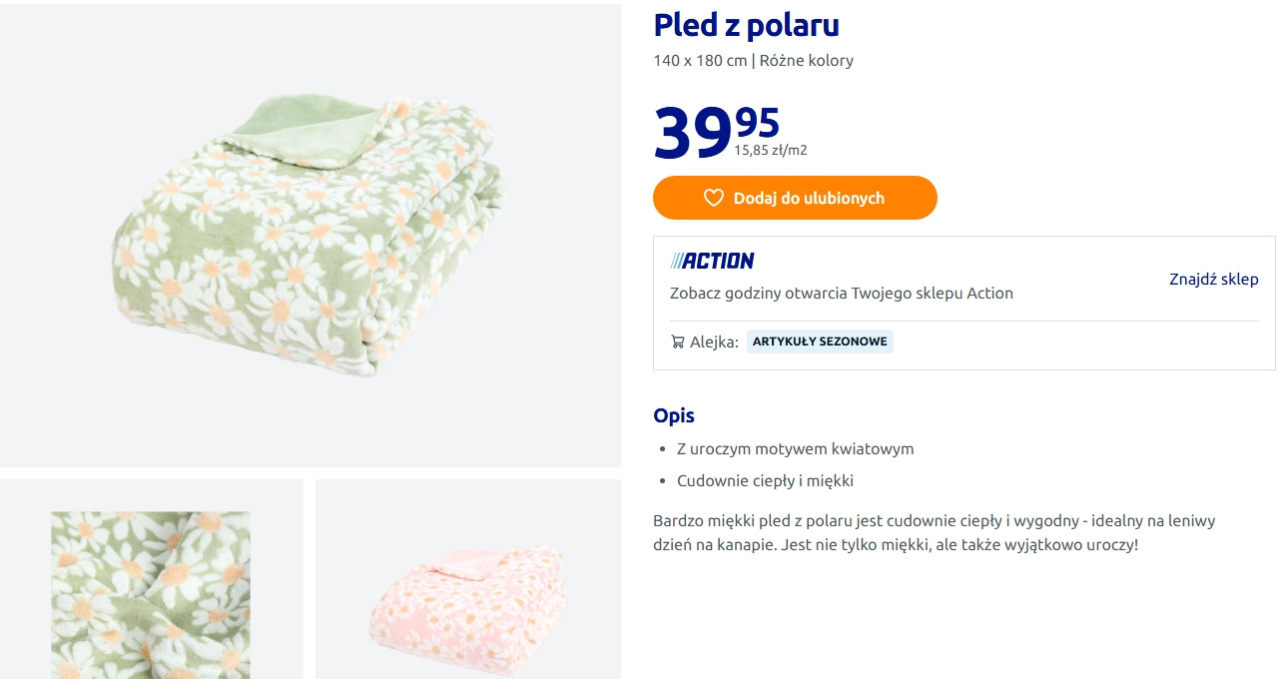 Pled z Action ma rozmiar 140 × 180 cm, więc jest naprawdę spory. Bez problemu można nim okryć się podczas siedzenia na balkonie lub na tarasie. Został wykonany z miękkiego polaru, dlatego jest przyjemny w dotyku i dobrze zatrzymuje ciepło.