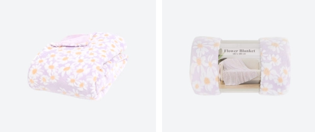 Kwiecisty pled z Action dostępny jest w kilku wersjach kolorystycznych. Najbardziej przyciąga uwagę zielony wariant, który wygląda jak fragment kwitnącej łąki. Jasne kwiaty na tle zieleni świetnie pasują do roślin doniczkowych i balkonowych skrzynek z pelargoniami czy bratkami.