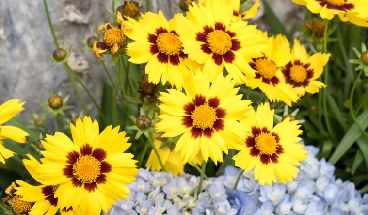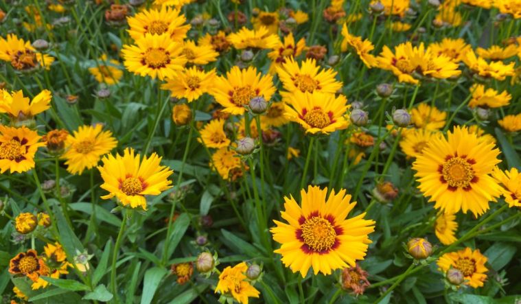 Nachyłek wielkokwiatowy (Coreopsis grandiflora) zachwyca intensywnie żółtymi, słonecznymi kwiatami, które przyciągają wzrok z daleka. Ich lekko postrzępione płatki nadają rabacie naturalny, nieco swobodny charakter. Roślina tworzy rozłożyste, ale niezbyt wysokie kępy, dzięki czemu dobrze prezentuje się zarówno na pierwszym planie rabaty, jak i w większych kompozycjach.