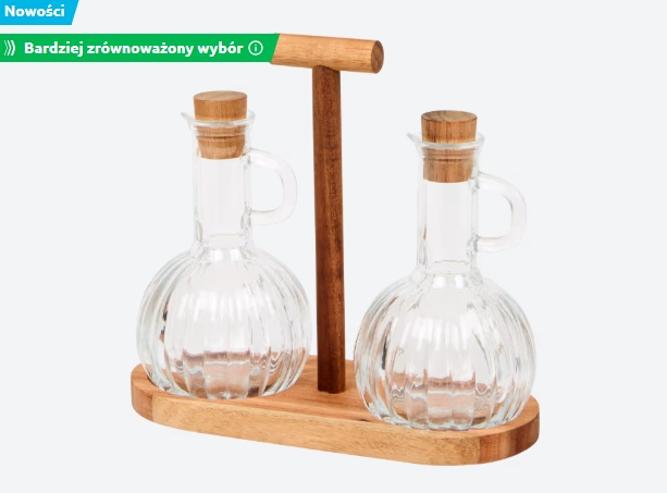 Zestaw na oliwę i ocet dostępny w Action za 19,95 zł składa się z dwóch karafek oraz drewnianej podstawki z pionowym uchwytem. Całość wykonano ze szkła i drewna akacjowego. Elementy mają wyraźnie ryflowaną powierzchnię, która nie tylko poprawia wygląd, lecz także wpływa na wygodę użytkowania. Zestaw ma wymiary 21 x 9,5 x 20 cm. Butelki wyposażono w wygodne uchwyty i szczelne korki dopasowane do otworów, co zapobiega rozlewaniu zawartości i ułatwia dozowanie.