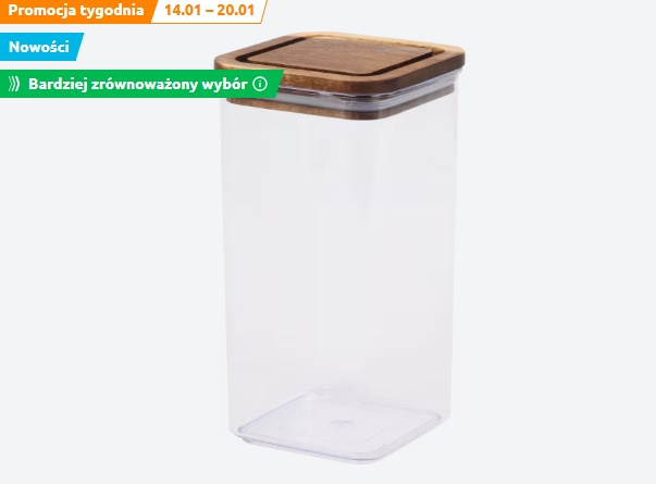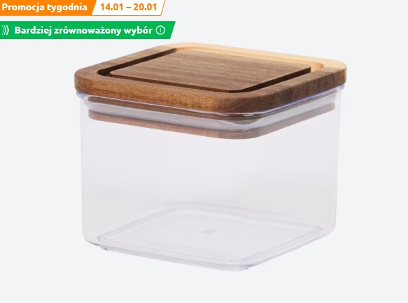 W ofercie Action można znaleźć także inne akcesoria kuchenne, które wpisują się w ten sam styl. W aktualnej promocji tygodnia dostępne są pojemniki do przechowywania z przezroczystego tworzywa z pokrywką z drewna akacjowego. Są dostępne w kilku wariantach pojemności, co pozwala na łatwe dopasowanie ich do indywidualnych potrzeb w kuchni.