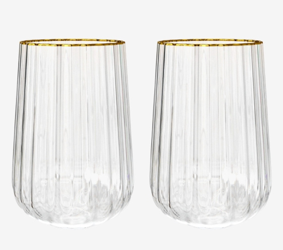 Ryflowane szklanki dostępne w Pepco oferowane są w zestawie po 2 sztuki w cenie 15 zł, co oznacza, że jedna kosztuje zaledwie 7,50 zł. Ich pojemność to 500 ml, a wykonane zostały z transparentnego szkła. Zdobienie w formie delikatnych żłobień oraz cienki, złoty rant nadają im elegancji, dzięki której dobrze komponują się z nowoczesnymi, jak i bardziej klasycznymi zastawami.