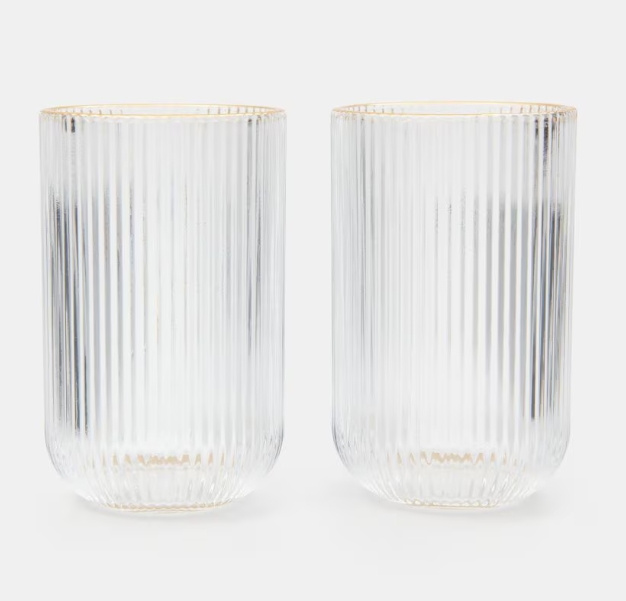 W ofercie Sinsay dostępny jest zestaw dwóch szklanek, które łączą w sobie praktyczność i elegancję. Każda z nich ma pojemność 400 ml oraz wymiary 13 cm wysokości i 8 cm średnicy. Wykonane są z bezbarwnego szkła. Posiadają ryflowaną powierzchnię, która nadaje im dekoracyjnego charakteru, a złoty rant subtelnie podkreśla ich wykończenie.