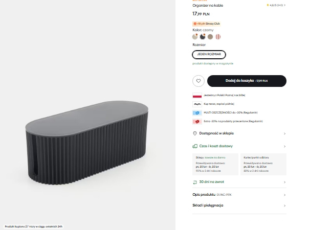 Organizer dostępny w Sinsay za 17,99 zł wyróżnia się prostą formą i ryflowaną powierzchnią, która nadaje mu nowoczesnego charakteru. Wymiary produktu to 33 cm x 13,5 cm x 11 cm, dzięki czemu bez problemu mieści listwę zasilającą oraz nadmiar przewodów. Zamykana pokrywka pozwala całkowicie ukryć zawartość, a jednocześnie zapewnia łatwy dostęp do wnętrza.
