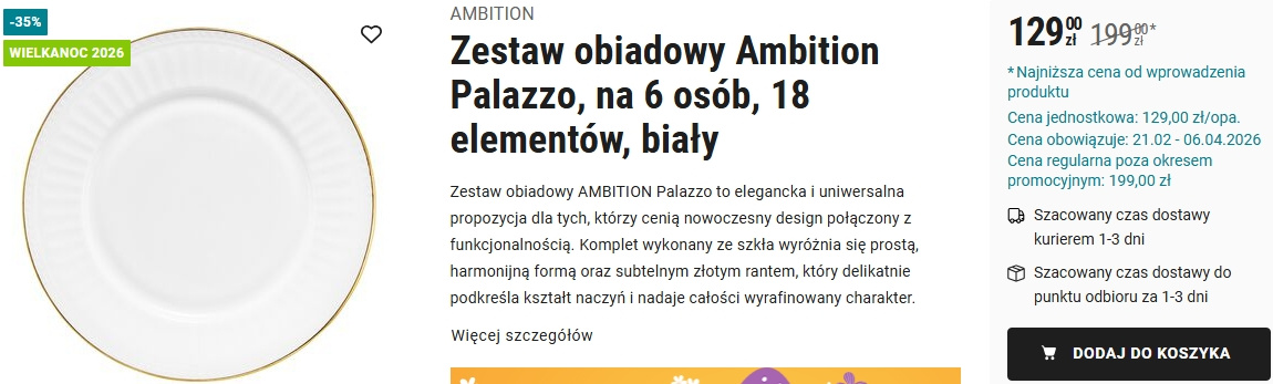 W związku z trwającą obecnie przedświąteczną wyprzedażą w sieci Biedronka zestaw obiadowy Ambition Palazzo kosztuje 35% taniej niż w regularnej ofercie, czyli 129 zł zamiast 199 zł.