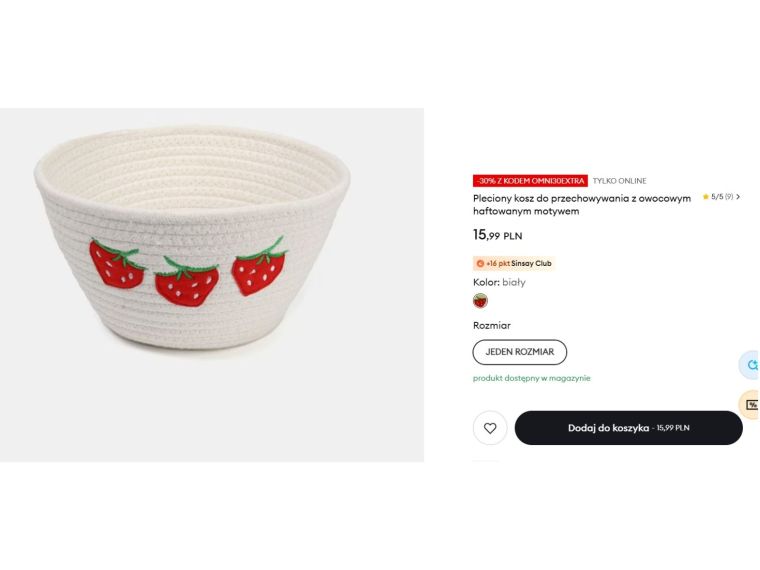 Z kolei pleciony kosz do przechowywania z owocowym, haftowanym motywem truskawek kosztuje 15,99 zł. To praktyczny, a jednocześnie dekoracyjny dodatek – można w nim trzymać poduszki, koc lub drobiazgi ogrodowe. W połączeniu z dodatkowym rabatem -30% te ceny stają się jeszcze bardziej atrakcyjne.