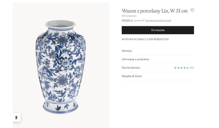 Podobny klimat można znaleźć w ofercie Westwing, gdzie dostępny jest porcelanowy wazon o bardzo zbliżonym charakterze wizualnym. Również tutaj pojawiają się delikatne, niebieskie zdobienia i kwiatowe ornamenty, które nadają całości ponadczasowego wyglądu. Różnica tkwi jednak w materiale i wykończeniu – Westwing oferuje produkt wykonany z porcelany, co przekłada się na jego bardziej szlachetny charakter i wyższą trwałość.