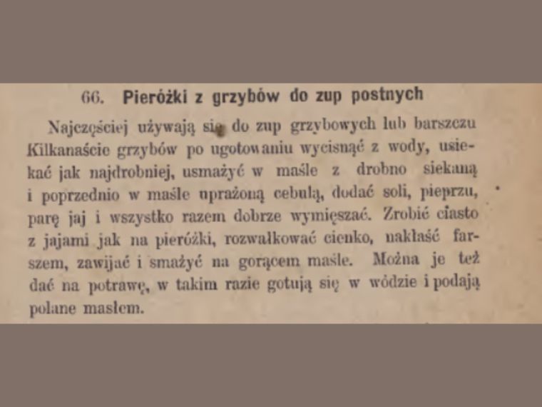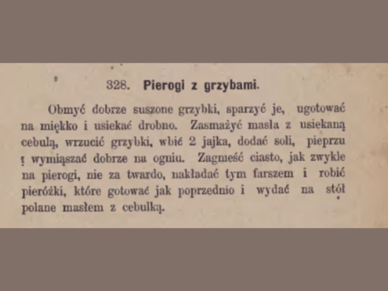 Warto jednak mieć na względzie, że to przepis na pierożki postne serwowane jako np. dodatek do zup. W innym przepisie z tej samej książki znajdziemy jednak podobne wytyczne. Przepis nr 328 na pierogi z grzybami uwzględnia co prawda suszone okazy, ale warto podpatrzyć, jak proponowano przyrządzać grzybowy farsz niespełna 100 lat temu. Również i tutaj grzyby mieszane są z cebulą, solą, pieprzem i jajami. To kolejny dowód na to, że grzyby tak naprawdę potrzebują niewiele, by zachwycić smakiem.