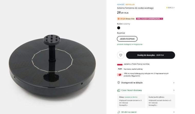 Na półkach Sinsay pojawiła się właśnie solarna fontanna do ogrodu, która niemal od razu stała się bestsellerem. To kompaktowe urządzenie o średnicy około 15,5 cm, utrzymane w uniwersalnym, czarnym kolorze, które bez problemu dopasuje się do różnych aranżacji. Największym atutem jest jednak sposób działania, bo fontanna zasilana jest energią słoneczną, więc nie wymaga żadnych kabli ani dodatkowych źródeł prądu.