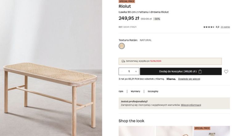 W ostatnim czasie takie plecione formy są naprawdę na topie. Widać je wszędzie, od drogich showroomów po inspiracje wnętrzarskie w sieci. Różnica jest taka, że zwykle ceny potrafią skutecznie ostudzić zapał. Dlatego tak zaskoczyła mnie ta promocja na stronie Sklum. Oryginalnie ławeczka była naprawdę droga, ale po przecenie to nie jest duży koszt, jak za tak porządny produkt na lata.