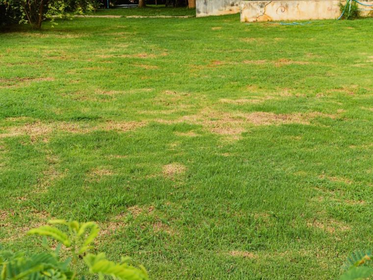 Jeżeli plamy pojawiają się co roku w tych samych miejscach, bardzo możliwe, że ziemia jest tam mocno ubita lub zalega w niej woda. Można więc napowietrzyć ziemię z pomocą wideł albo aeratora.