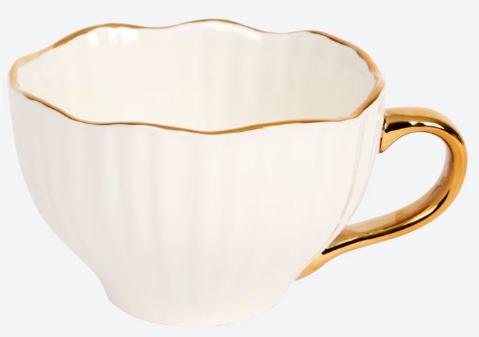Do kompletu można dobrać miskę Arista o wymiarach 14,5 × 6 cm za 12,95 zł. To rozmiar odpowiedni do zup krem, owsianek, deserów czy drobnych dodatków. Ostatnim elementem kolekcji jest kubek do kawy (Ø 10 × 7 cm) w cenie 11,95 zł, który wyróżnia się złotym uchem. Dzięki temu cała seria prezentuje się spójnie, mimo że jest niewielka.