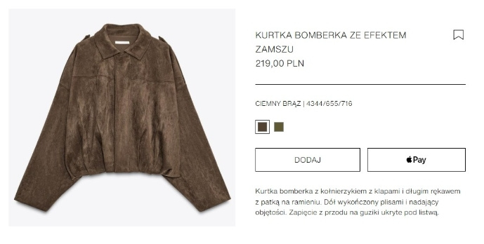 Zamszowa kurtka z Zary to bomberka z kołnierzykiem z klapami i długim rękawem z patką na ramieniu. Dół został wykończony plisami, które nadają całości objętości i lekko modelują sylwetkę. Z przodu znajduje się zapięcie na guziki ukryte pod listwą, co sprawia, że fason wygląda minimalistycznie i bardzo estetycznie.