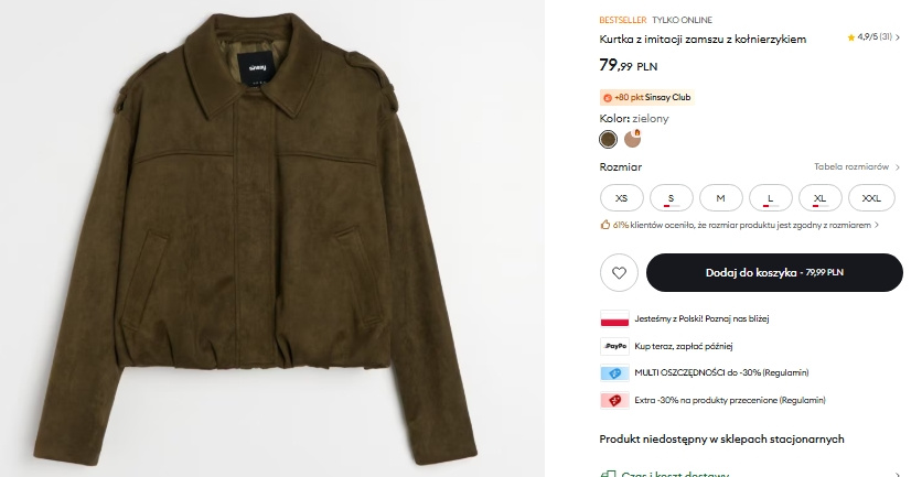 Model wykonano z poliestru z domieszką elastanu, a materiał imituje zamsz i wizualnie prezentuje się bardzo podobnie do droższej wersji. Kurtka nie ma ocieplenia, nie jest wodoodporna i została zaprojektowana jako okrycie przejściowe. Jeśli więc zależy ci na modnym wyglądzie bez nadwyrężania budżetu, ta propozycja z Sinsay może być strzałem w 10.