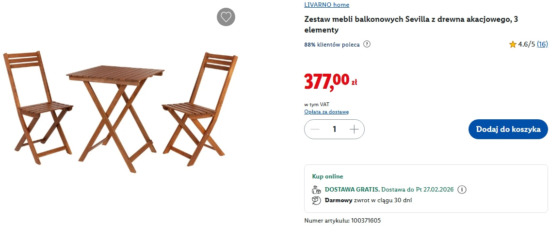 Lidl również proponuje modny 3-elementowy zestaw mebli balkonowych z drewna akacjowego, przeznaczony do użytku na zewnątrz. W komplecie znajdują się 2 krzesła i 1 stolik, a całość ma olejowane wykończenie, które podkreśla naturalny rysunek drewna i dodatkowo zabezpiecza powierzchnię.