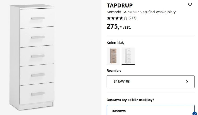 Dodatkowym atutem jest prosty, minimalistyczny design. Jasny kolor optycznie powiększa przestrzeń, a prosta forma nie przytłacza wnętrza. Dzięki temu komoda sprawdzi się zarówno w nowoczesnych, jak i bardziej tradycyjnych aranżacjach. Komoda kosztuje tylko 275 zł. W wersji w okleinie drewnopodobnej kosztuje 300 zł.
