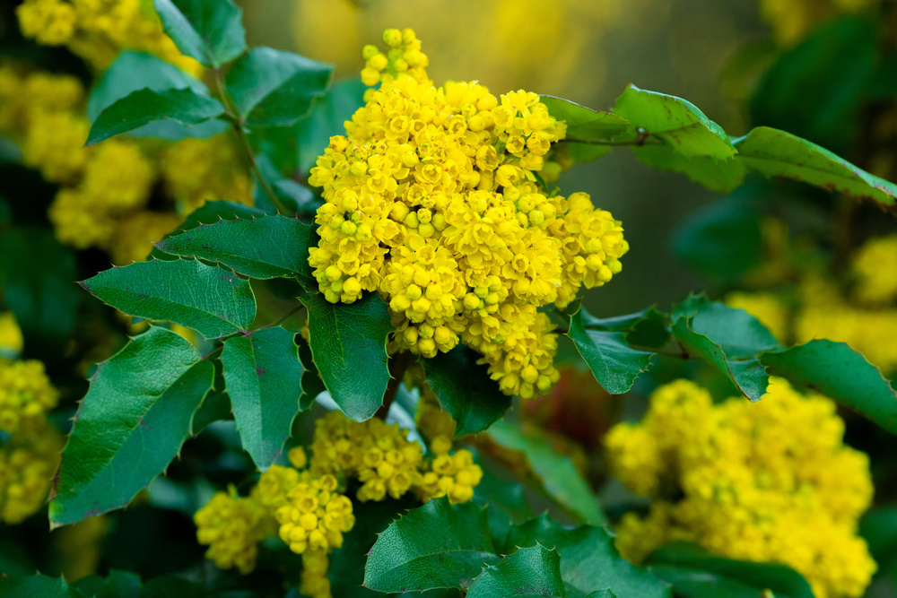 Mahonia ma efektowne, ostro zakończone liście, które latem są intensywnie zielone, a zimą często nabierają bordowego odcienia. Wczesną wiosną pojawiają się na niej jaskrawożółte kwiaty, a latem granatowe owoce, przypominające jagody.
