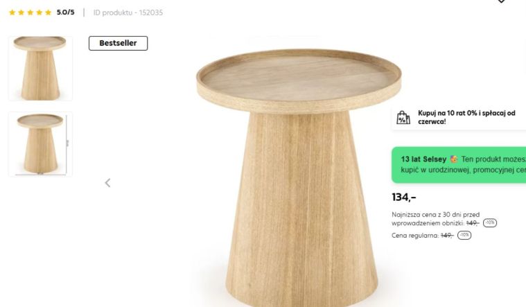 I wiesz co jeszcze? On naprawdę wygląda drożej, niż kosztuje. Ta okleina robi świetne wrażenie. Na pierwszy rzut oka nikt nie zgadnie, że to nie lite drewno. A jednak cena jest taka, że nie trzeba się długo zastanawiać. Dla mnie to idealne połączenie. Ładny wygląd i rozsądna cena. I nie mam poczucia, że to coś „na chwilę”, tylko raczej na dłużej. Normalnie stoliki w tym stylu i takiej jakości kosztują fortunę. Na stronie Selsey, ten model jest teraz przeceniony i wydałam zaledwie 134 zł. To naprawdę mało jak za taką jakość i design.