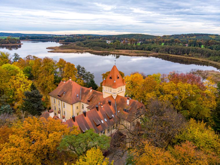 Zamek w Osiecznej leży nad brzegiem jeziora. / fot: Jacek/AdobeStock
