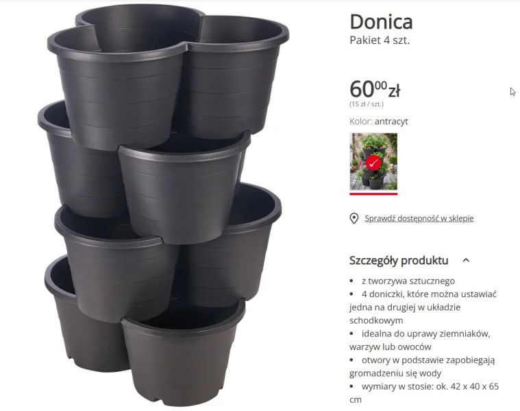 Doniczki do ziół z KIK sprzedawane są w praktycznym zestawie czterech elementów, które możesz ustawiać jeden na drugim w układzie schodkowym. Taka forma pozwala stworzyć pionową kompozycję, dzięki której uprawa ziół zajmuje mniej miejsca To rozwiązanie dobrze sprawdza się zarówno na balkonie, jak i w kuchni czy na tarasie. Oczywiście nie musisz ich stawiać jedna na drugiej, jeśli masz szczęście posiadania dużego balkonu.