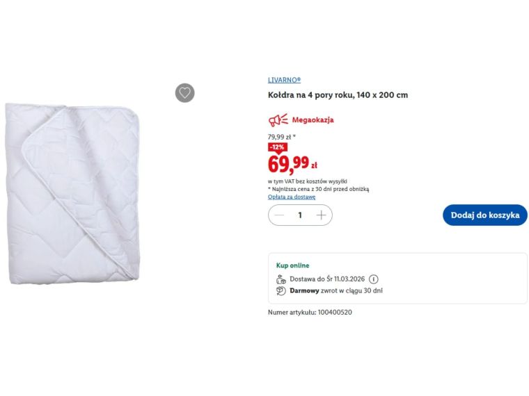 W ofercie Lidl od 2 marca dostępna jest kołdra Livarno Home na 4 pory roku w rozmiarze 140 x 200 cm. Produkt składa się z dwóch warstw łączonych zatrzaskami. Wypełnienie stanowią włókna poliestrowe, a pikowanie ma zapobiegać przesuwaniu się wsadu. Producent informuje, że kołdrę można prać w temperaturze do 95°C oraz suszyć w suszarce bębnowej, co może mieć znaczenie dla osób zwracających uwagę na higienę. Regularna cena została obniżona o 10 zł – obecnie model kosztuje 69,99 zł. Promocja ma charakter czasowy i obowiązuje od 2 marca, do wyczerpania zapasów.
