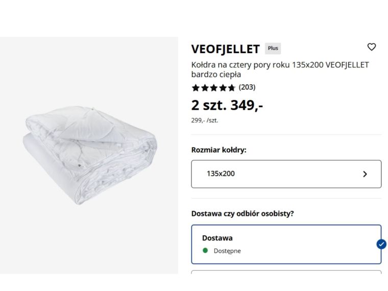Z kolei w Jysk dostępna jest kołdra Vejofjellet 135 x 200 cm, również w wersji na cztery pory roku. W tym przypadku komplet składa się z dwóch kołder spiętych guzikami. Wypełnienie to silikonowane, spiralne włókno rurkowe o gramaturze 630/1300 g, a poszycie wykonano w 100% z mikrofibry poliestrowej. Kołdrę można prać w 60°C. Aktualna oferta obejmuje zakup dwóch sztuk w cenie 349 zł (co odpowiada 299 zł za sztukę przy standardowej cenie jednostkowej). Produkt znajduje się w stałej ofercie sieci.