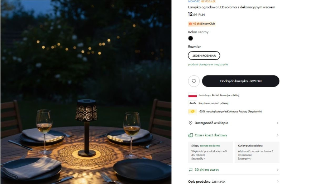 Lampa solarna za 12,99 zł z nowej kolekcji ogrodowej w Sinsay zachwyciła mnie tak bardzo, że od razu przestałam przewijać dalej i kliknęłam w ofertę na stronie.
