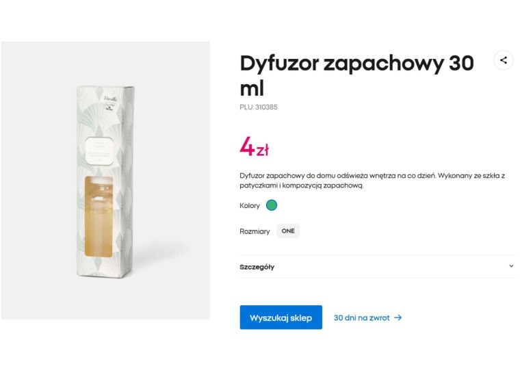 Na półkach z dekoracjami i świecami w Pepco można znaleźć mały dyfuzor zapachowy o pojemności 30 ml. Produkt kosztuje tylko 4 zł i składa się ze szklanego flakonu z kompozycją zapachową oraz patyczków, które stopniowo uwalniają aromat do wnętrza. Zapach jest słodki i delikatny – wielu osobom kojarzy się z wanilią i domowymi wypiekami.
