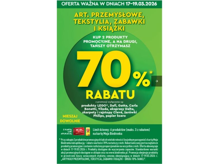 Promocja obowiązuje w dniach 17–19 marca 2026 roku i dotyczy wybranych produktów oznaczonych jako promocyjne. Mechanizm jest prosty: kupując dwa artykuły objęte akcją, tańszy z nich można dostać aż o 70% taniej. Rabat naliczany jest automatycznie przy kasie, ale tylko wtedy, gdy produkty spełniają warunki oferty i znajdują się w odpowiednich kategoriach. W praktyce oznacza to, że odpowiednie dobranie produktów może znacząco zwiększyć realną wartość oszczędności.