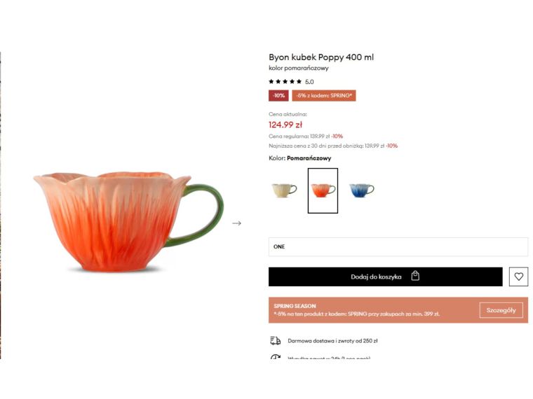 W sklepach z designerskimi dodatkami do domu można znaleźć naprawdę piękne kubki. Jednym z nich jest model Poppy od marki Byon. To ręcznie malowany kubek o pojemności około 400 ml, który wygląda jak duży kwiat. Ma intensywny pomarańczowy kolor, falowane brzegi i bardzo dekoracyjną formę.