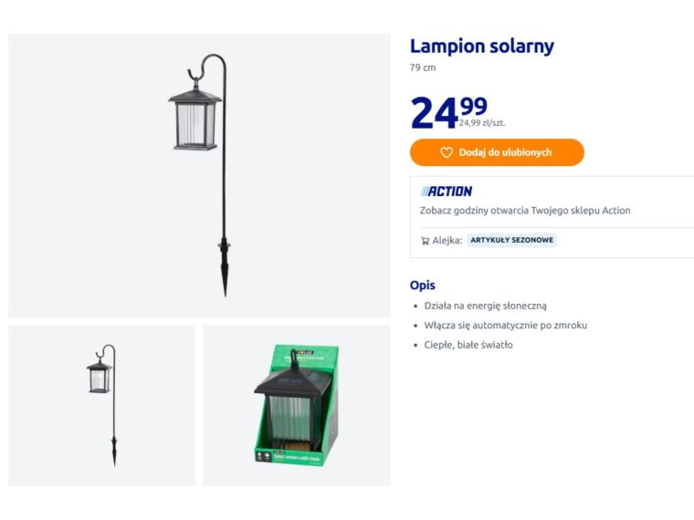 Brak kabli i konieczności podłączania do prądu to duża zaleta – latarenkę można ustawić w dowolnym miejscu: przy ścieżce, na rabacie, wzdłuż podjazdu, przy tarasie czy w dużej donicy na balkonie. Przy cenie 24,99 zł za sztukę łatwo stworzyć spójną kompozycję z kilku punktów świetlnych, na przykład wyznaczając nimi alejkę lub podkreślając wybrane fragmenty ogrodu. W Action to jedna z bardziej budżetowych propozycji oświetlenia dekoracyjnego w tym stylu.