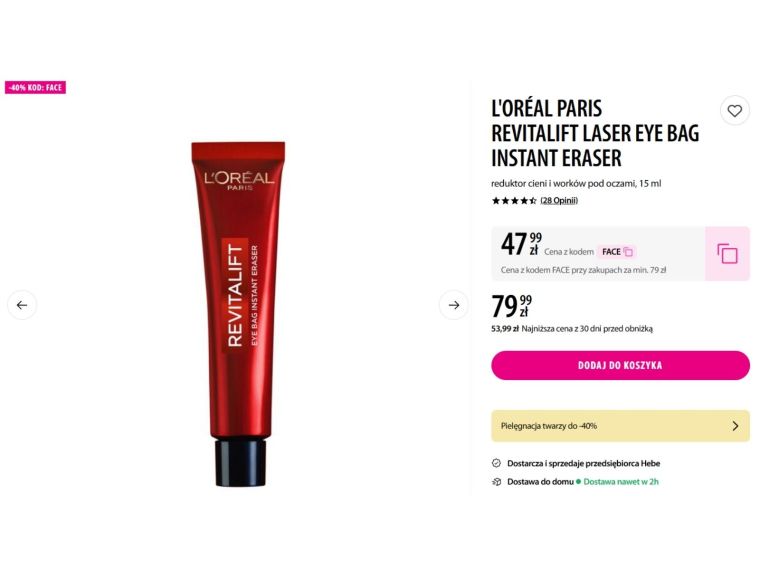 Osoby zainteresowane tym kosmetykiem mogą zwrócić uwagę na aktualną promocję w drogeriach Hebe. L’Oréal Paris Revitalift Laser Eye Bag Instant Eraser kosztuje standardowo 79,99 zł, jednak obecnie można kupić go znacznie taniej. W Hebe obowiązuje promocja sięgająca 40 proc., dzięki której cena spada do 47,99 zł przy użyciu kodu FACE. Warunkiem skorzystania z rabatu jest dokonanie zakupów za minimum 79 zł. Takie akcje promocyjne w Hebe pojawiają się regularnie przy okazji wybranych kategorii pielęgnacyjnych, dlatego wiele osób wykorzystuje je do uzupełnienia codziennej kosmetyczki.
