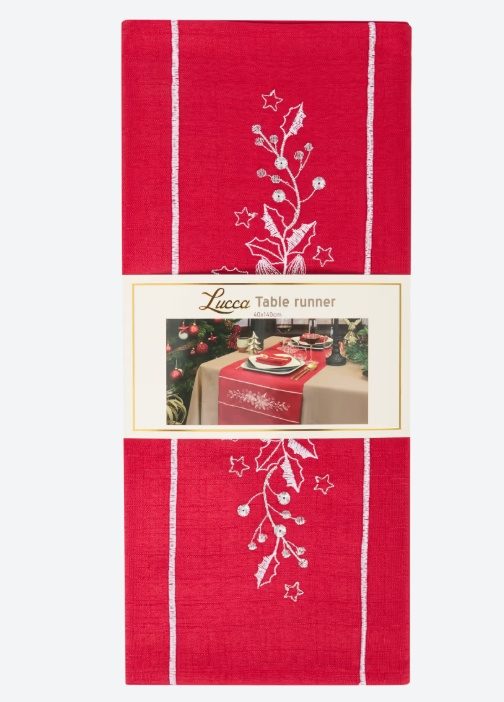 W Action dostępny jest bieżnik w klasycznym świątecznym stylu. Produkt ma wymiary 40 x 140 cm i dostępny jest w czterech wariantach kolorystycznych: czerwonym, zielonym, szarym i białym. Każdy z modeli zdobi subtelny srebrny haft, który nadaje dekoracji odświętnego charakteru. Tkanina dobrze się układa i pasuje do większości stołów, co czyni ją uniwersalnym wyborem na wigilijną kolację.