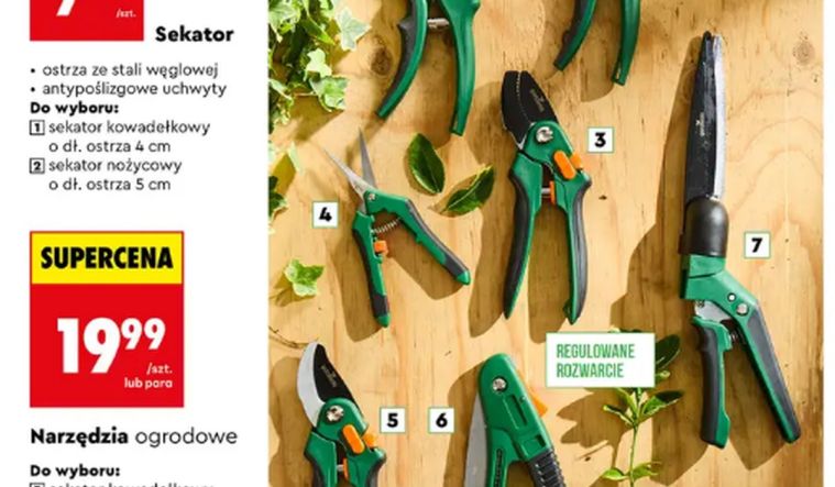Ale to nie koniec narzędziowej oferty. Jeśli potrzebujesz czegoś tańszego, Biedronka ma też podstawowe sekatory od 7,99 zł, tj. kowadełkowy do suchych gałęzi i nożycowy do świeżych. Do tego składana piła do gałęzi za 19,99 zł i nożyce do trawy z obrotowym ostrzem w tej samej cenie. A dla tych, którzy mają rozległy żywopłot nożyce z teleskopowymi uchwytami za 49,99 zł, dzięki którym dotniesz wyższe partie bez drabiny.