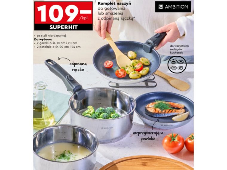 Zestaw jest do nabycia od 30 października w sklepach sieci Biedronka. Stal nierdzewna, poręczność i nowoczesny design, a przy maksymalna funkcjonalność – tak można pokrótce opisać oferowany w najnowszej gazetce zestaw od marki Ambition. Czego chcieć więcej? Tylko niskiej ceny, ale również i tym zajęła się Biedronka. Za lekko ponad 100 zł dorwać można istne cudeńko.