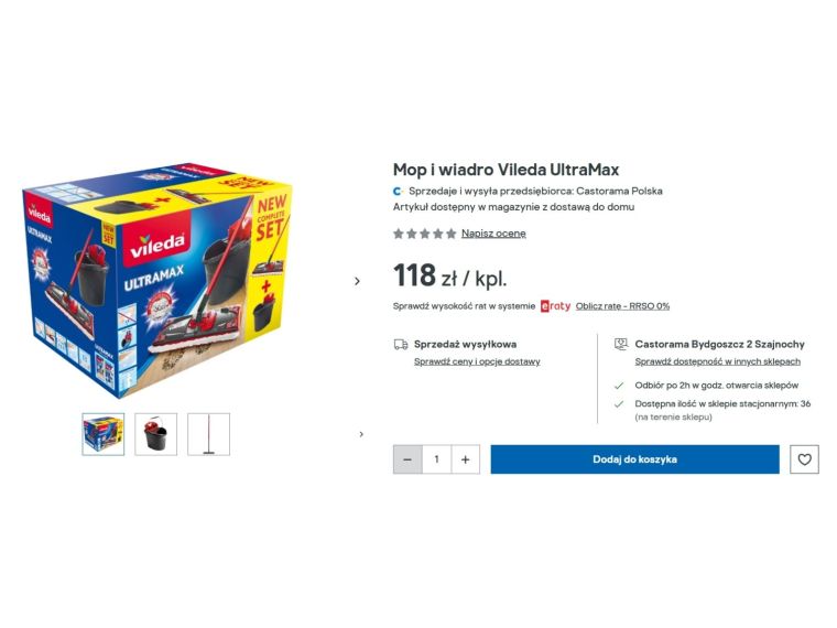 Ten sam model mopa jest dostępny także w innych popularnych sklepach z wyposażeniem domu. Jednym z nich jest Castorama, gdzie zestaw Vileda Ultramax XL można znaleźć w regularnej sprzedaży. Pod względem funkcjonalności jest to dokładnie ten sam produkt – w komplecie znajduje się płaski mop z szeroką głowicą oraz wiadro z wyprofilowanym wyciskaczem, który pozwala łatwo odsączyć wodę z nakładki.
