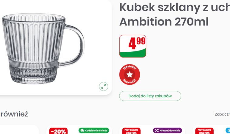 W ofercie Dino można znaleźć ryflowane szklanki, które wyróżniają się bardzo korzystną ceną – kosztują zaledwie 4,99 zł za sztukę. To naprawdę niewiele, zwłaszcza jeśli porównasz je z podobnymi modelami dostępnymi w sklepach wnętrzarskich, gdzie ceny potrafią być kilkukrotnie wyższe.
