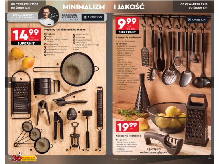 Biedronka na kilku stronach katalogu z promocjami oferuje szereg przeróżnych gadżetów do kuchni marki Ambition w atrakcyjnych cenach. Oferta obowiązuje od czwartku, 23 października do środy, 5 listopada. Czasu wydaje się dużo, ale towar może wyprzedaż się na pniu. W ofercie znajdziemy nie tylko popularne sztućce, garnki czy patelnie, z których słynie marka, ale też sprzęt AGD oraz akcesoria codziennego użytku. Wszystkie z wymienionych utrzymane są w czarnym kolorze przodującym ostatnimi czasy we wnętrzarskich trendach, również jeśli chodzi o kuchnię i jej wyposażenie.