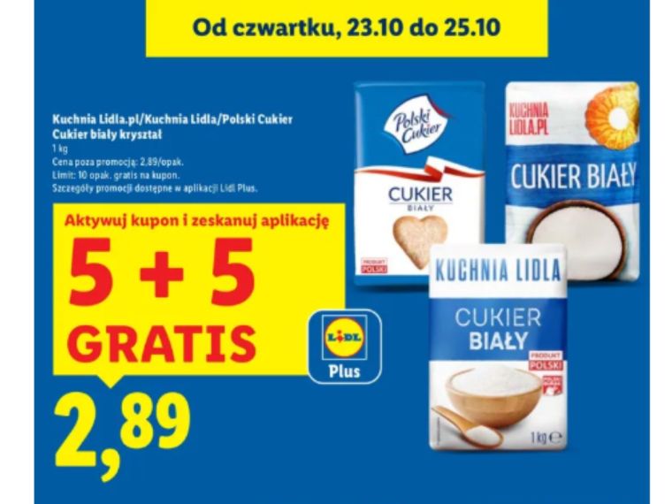 Od czwartku 23 października w Lidlu będzie można kupić cukier biały w promocji 5+5. Nie warto zwlekać, bo oferta potrwa tylko do soboty, 25 października. Zasady są proste: kupując pięć dowolnych opakowań cukru białego w Lidlu (po 2,89 zł), kolejne pięć otrzymujemy gratis. Mowa o produktach spod marki Polski Cukier, Kuchnia Lidla oraz Kuchnia Lidla.pl – na te trzy obowiązuje promocja, można je miksować dowolnie.