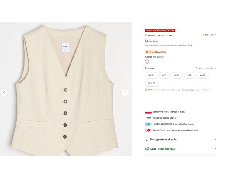 Kiedy zbliża się wiosna, zawsze przeglądam sklepy w poszukiwaniu rzeczy, które odświeżą garderobę, ale nie zrujnują portfela. W tym roku szczególnie zwracam uwagę na klasykę w jasnych kolorach. Beże, kremy, proste fasony, które można nosić do pracy i na wyjście. I właśnie wtedy wpadła mi w oko garniturowa kamizelka przeceniona do 14,99 zł. To jeden z tych zakupów, które cieszą podwójnie, bo są i praktyczne, i po prostu ładne.