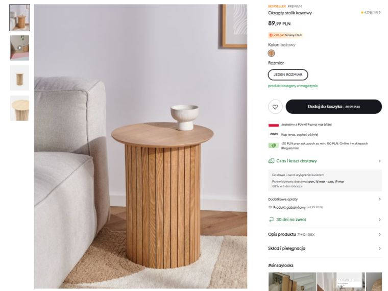 Jednym z największych atutów tego stolika jest jego kolorystyka. Beż od kilku sezonów pozostaje jednym z najmodniejszych odcieni we wnętrzach. Jest neutralny, ciepły i bardzo uniwersalny, dzięki czemu pasuje do wielu stylów aranżacyjnych. Beżowy stolik z Sinsay dobrze odnajdzie się we wnętrzach w stylu skandynawskim, gdzie dominują jasne kolory i naturalne materiały. Równie dobrze może uzupełnić aranżacje minimalistyczne lub nowoczesne, w których liczy się prostota formy.