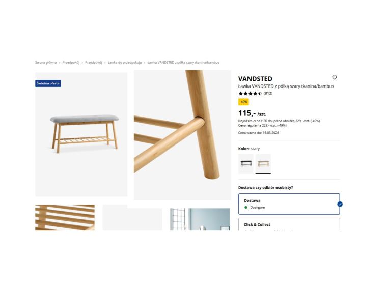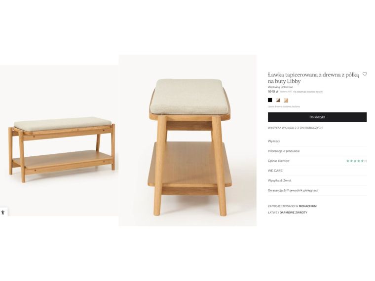 Pod siedziskiem znajduje się półka na buty wykonana ze sklejki z fornirem dębowym. Całość wygląda bardzo elegancko i pasuje do modnych wnętrz w stylu skandynawskim czy vintage. Problem pojawia się dopiero przy cenie. Za tę ławkę trzeba zapłacić aż 1649 zł. Dla wielu osób to naprawdę spory wydatek jak na mebel do przedpokoju.