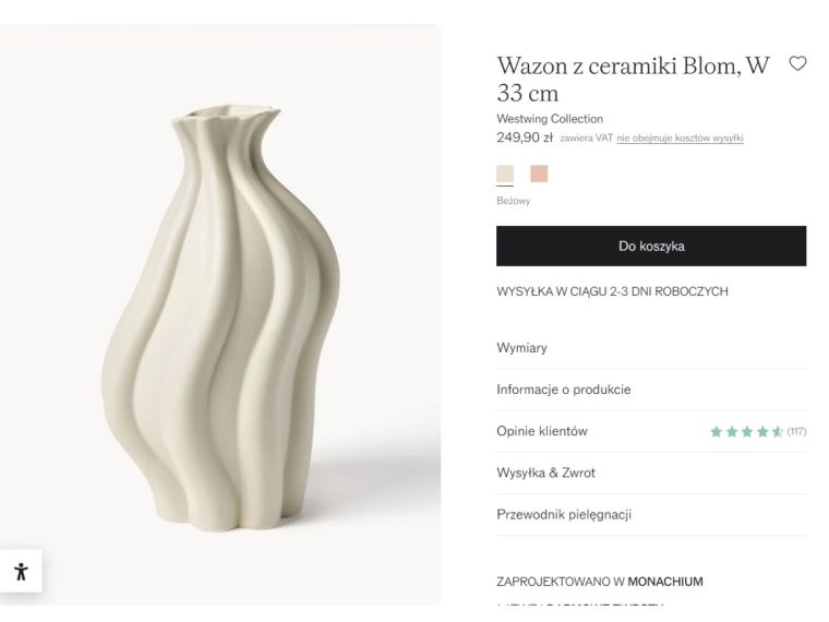 W ofercie Westwing można znaleźć wazon Blom, który od razu przyciąga uwagę swoim rzeźbiarskim kształtem. Ma charakterystyczną, falistą formę przypominającą skręcone płatki lub miękką tkaninę zastygłą w ceramice. Dzięki temu wygląda jak designerski dodatek z galerii wnętrzarskiej. Model ma około 33 cm wysokości i wykonany jest z ceramiki w modnym, matowym odcieniu beżu. Jego minimalistyczny kolor sprawia, że łatwo dopasować go do wielu aranżacji – od jasnych, skandynawskich przestrzeni po cieplejsze wnętrza w stylu japandi. Cena wazonu w Westwing wynosi 249,90 zł, co plasuje go w segmencie dekoracji premium.
