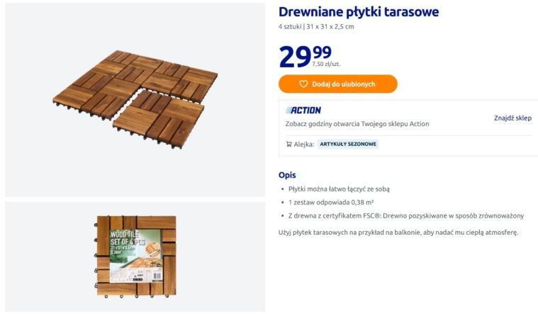 Gdy tylko weszłam do sklepu, od razu na wejściu przywitały mnie te drewniane płytki tarasowe z Action. Dla wielu osób to nieodłączny element balkonu lub tarasu. Inne marki potrafią sporo sobie policzyć za ten modny dodatek, ale nie Action. Tutaj kosztują one tylko 29,99 zł za 4 sztuki. Jedna płytka wychodzi więc za około 7,49 zł.