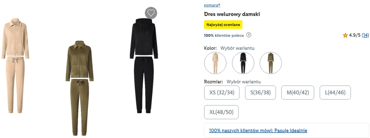 Jedną z propozycji, która robi absolutną furorę wśród Polek, jest ten welurowy komplet z Lidla dostępny w cenie 69,99 zł. To gotowy zestaw składający się z 2 elementów, który łączy wygodę z estetycznym, dopracowanym wyglądem. Model dostępny jest w 3 kolorach: beżowym, oliwkowym oraz czarnym, dzięki czemu łatwo dopasować go do własnego stylu.