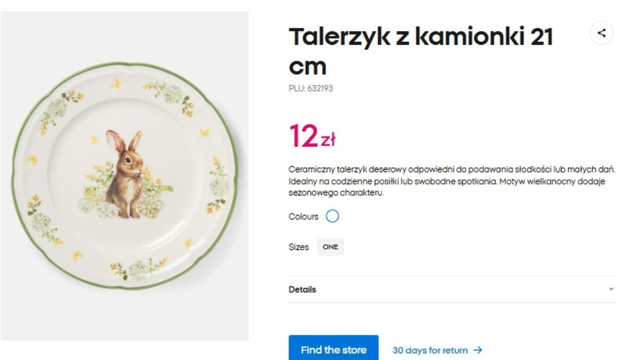 Do tego dochodzi ta cienka, zielona obwódka, która ładnie domyka całość i sprawia, że talerzyk wygląda elegancko. Od razu skojarzył mi się z zastawami, które kiedyś stały u babci w kredensie. Takie rzeczy miały swój urok i nie były idealne w katalogowy sposób, tylko właśnie bardziej „domowe”. Ten talerzyk daje bardzo podobne wrażenie i dlatego tak dobrze wpisuje się w wielkanocny klimat.