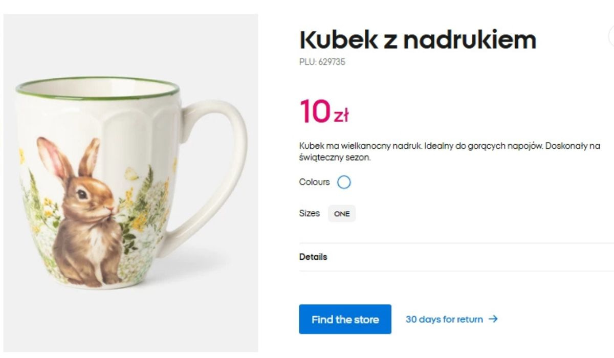 Do talerzyka Pepco oferuje również kubek w tym samym wzorze. Razem tworzą spójny komplet, który wygląda naprawdę elegancko i świątecznie. Ten sam delikatny królik, subtelne kwiaty i jasna kolorystyka sprawiają, że wszystko idealnie do siebie pasuje.