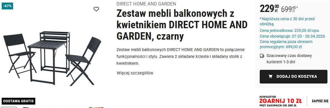 Na stronie Biedronka Home pojawił się zestaw balkonowy Direct Home and Garden w mocno obniżonej cenie. Zamiast 699 zł kosztuje teraz 229 zł, czyli aż o 67% mniej. Promocja obowiązuje do 26 kwietnia 2026 roku lub do wyczerpania zapasów.