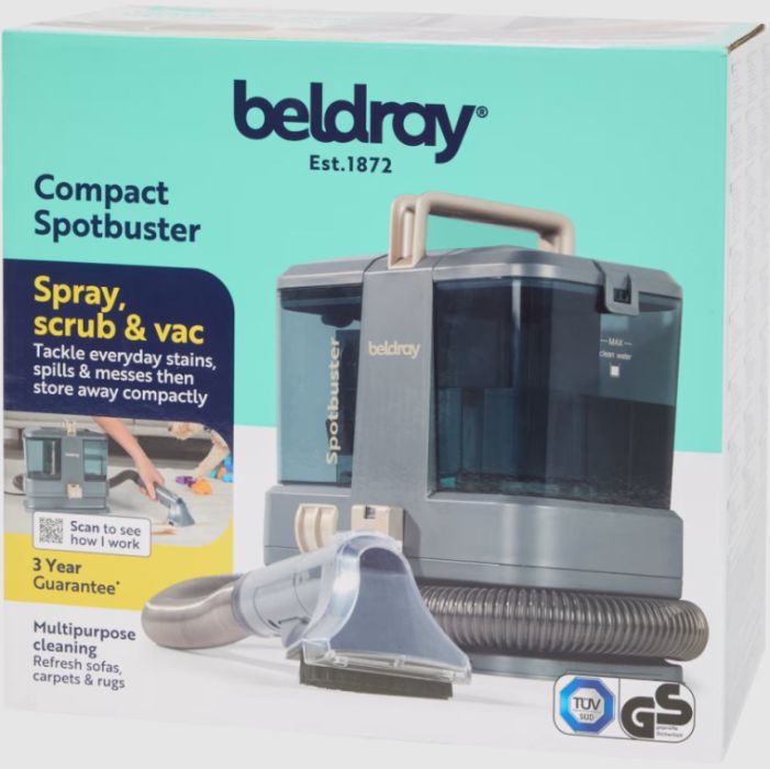 Urządzenie do usuwania plam Beldray (Compact Spotbuster) działa w prosty sposób. Do jednego zbiornika wlewasz czystą wodę, możesz dodać do niej środek czyszczący do tapicerki. Drugi zbiornik przeznaczony jest na brudną wodę, którą sprzęt odsysa z czyszczonej powierzchni.